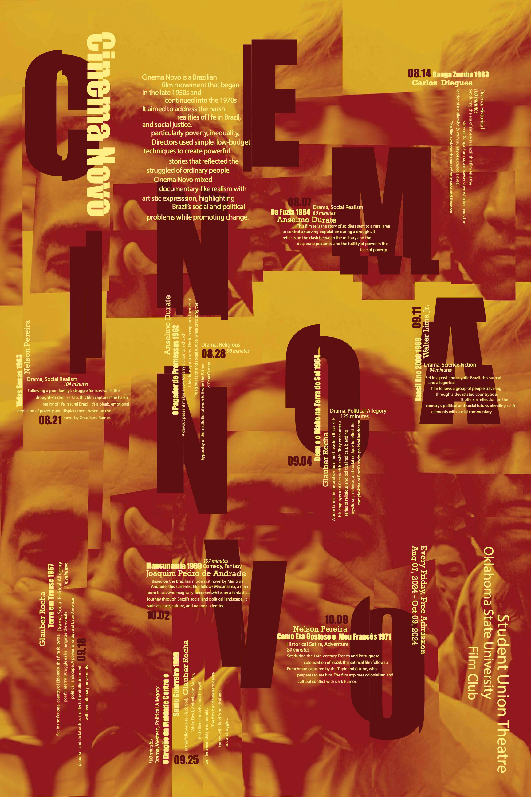 I was given the opportunity to design a poster for a fictional film festival for the OSU Film Club, highlighting the film movement, Cinema Novo. This poster embodies Cinema Novo’s raw, fragmented aesthetic, reflecting Brazil’s social and political turmoil in the 1960s-70s. The image of a man silencing another symbolizes censorship and oppression, central themes of the movement. Disjointed elements highlight the fractured society, while red signifies struggle and yellow represents hope for a better future. This final poster was designed to be folded perfectly into a 12 page page program to be handed to guests at the festival.