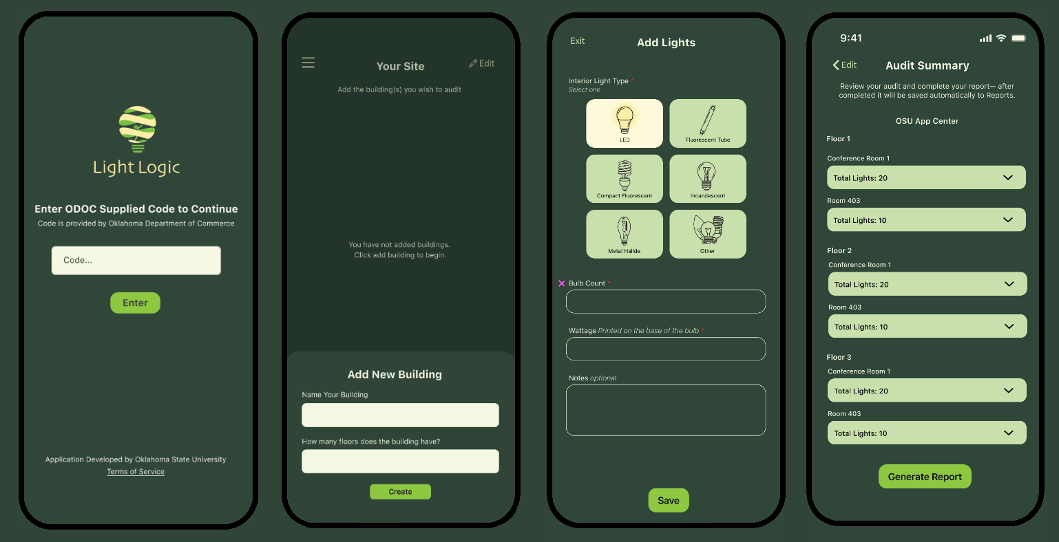 This app is a specialized energy-audit tool for commercial and municipal users particularly cities and outdoor facilities, seeking to upgrade their lighting systems and qualify for grants through the Oklahoma Department of Commerce (ODOC). It guides users through a structured process to collect the minimum data needed to calculate savings, focusing on whether fixtures are LED or non-LED, current wattage, and existing energy efficiency.